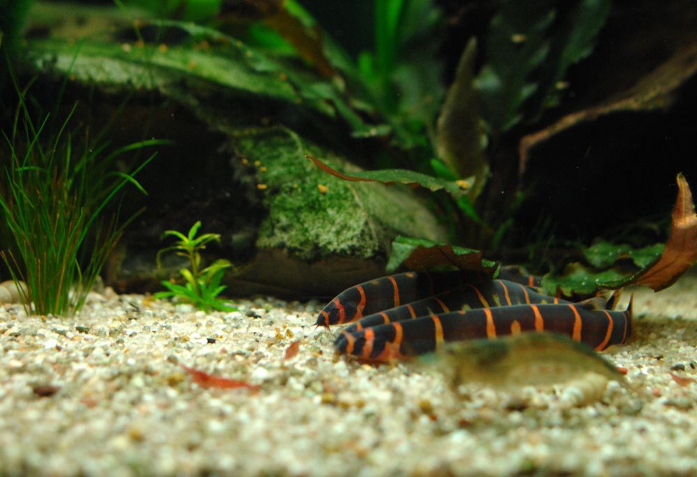 Acanthophthalmus kuhli (акантофтальмус кюля, колючеглаз) – один из немногих представителей рода, которого можно встретить в аквариуме. Аквариумистам он полюбился благодаря его неуемной энергии, которую он направляет на борьбу за чистоту в водоеме, подбирая и поедая все остатки пищи, упавшие на дно.