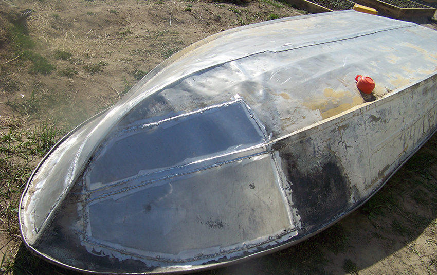 Алюминиевые лодки славятся своей неприхотливостью в уходе, а так же легкостью ремонта. Если вы получили пробоину, стоит лишь наложить заплатку и закрепить ее с помощью сварки или заклепок. По месту заплатки следует применить герметик. Ничего сложного в ремонте лодки нет. Если не сможете сами сделать, обратитесь в сто, к сварщикам.