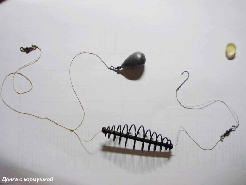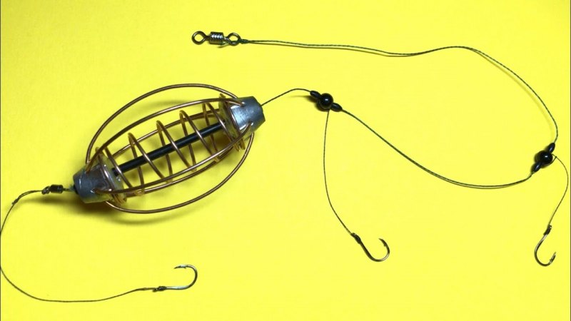 Чтобы увеличить шансы поимки рыбы, к донной оснастке добавляется кормушка. Причем, кормушка в это время выступает в роли грузила, что весьма удобно. Классический монтаж с кормушкой имеет следующий вид: