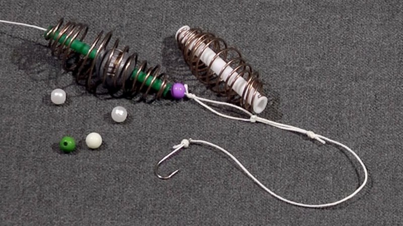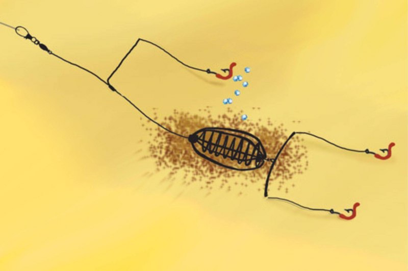 В первом случае оснастку можно назвать «соской», рыболовы часто ее так называют, либо в целом такую рыбалку называют ловлей на пружину. Суть в том, что в кормушку набивается вязкий корм, можно целым комком, превышающим размеры кормушки и внутрь этого комка, где-то ближе к поверхности втапливают крючок с приманкой.