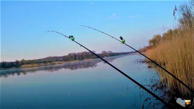 - Если вы ловите в стоячем водоеме, то удилища лучше размещать параллельно берегу, чтобы кончик располагался на высоте не больше 40 сантиметров.