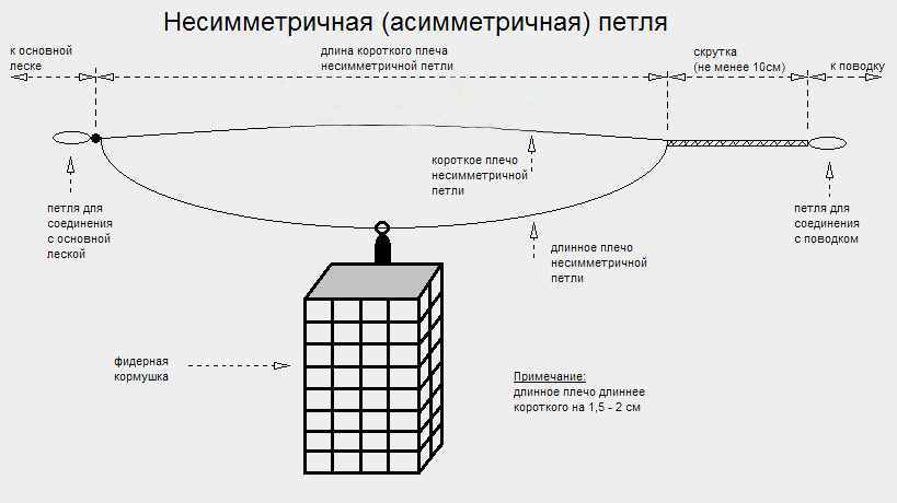Несимметричная петля для фидера отличается от классической тем, что одно ее плечо длиннее другого примерно на 10 см. Кормушка привязывается к более длинному концу асимметричной оснастки, что заметно усиливает чувствительность фидера в целом и передает на вершину удилища даже самые небольшие колебания крючка или перемещения лески.
