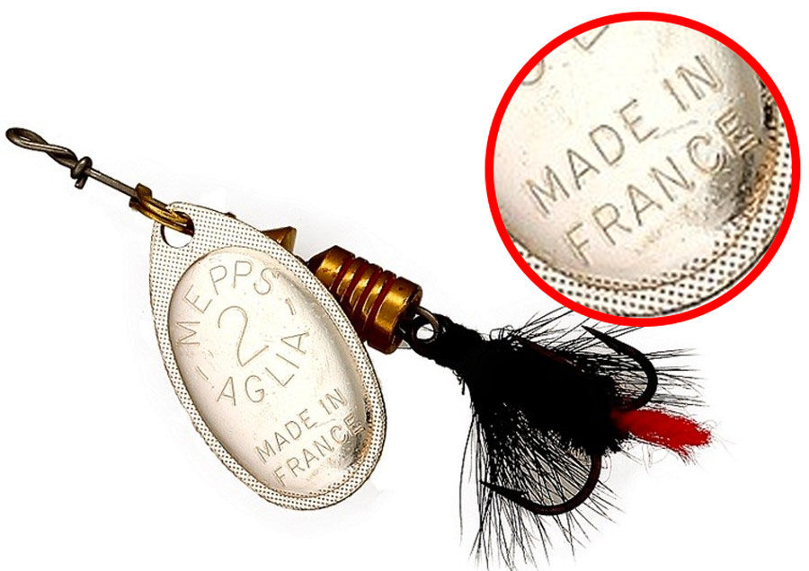 В оригинальной блесне Mepps на лепестке должна быть надпись «Made in France»