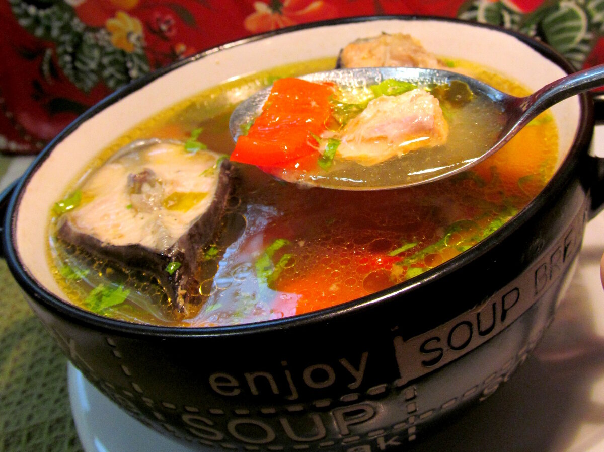 - Полученный суп разливают по тарелкам, добавляя куски рыбы. Посыпают порубленной зеленью.