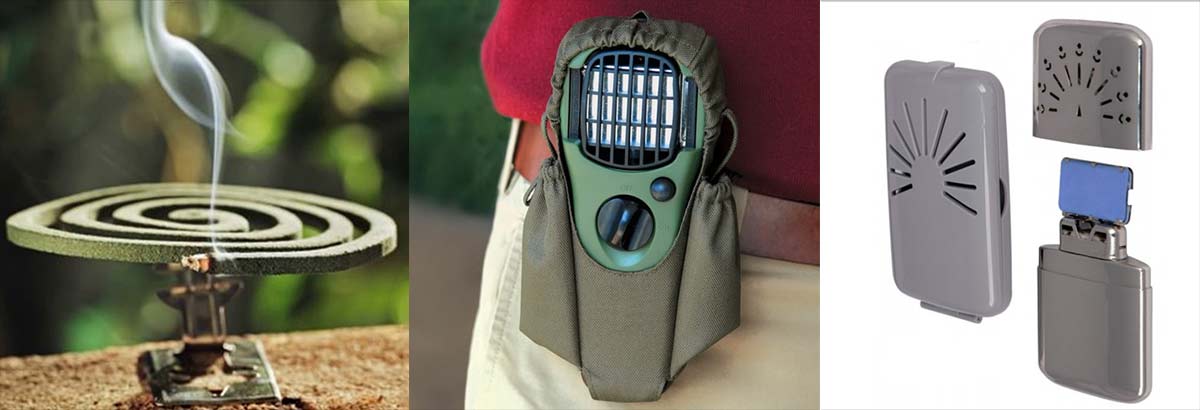 - Бензиновая грелка-фумигатор. Представляет собой каталитическую бензиновую грелку для рук, со специальной насадкой в которую устанавливаются пластины для фумигатора. Вещь эффективная особенно, если находится на поясе, и больше подходит для рыбаков. Тем не менее можно использовать и в лагере, количество комаров заметно снижается. Можно греть руки, положить в карман, или высушить промокшую обувь. Пожаробезопасные, запах и вред немного легче чем у противокомаринных спиралей, но так же может вызвать дискомфорт. Из минусов нужно брать с собой специальный бензин.