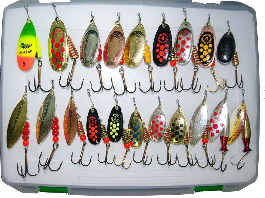 - Mepps (наиболее популярные вращающиеся блесна различных оттенков).