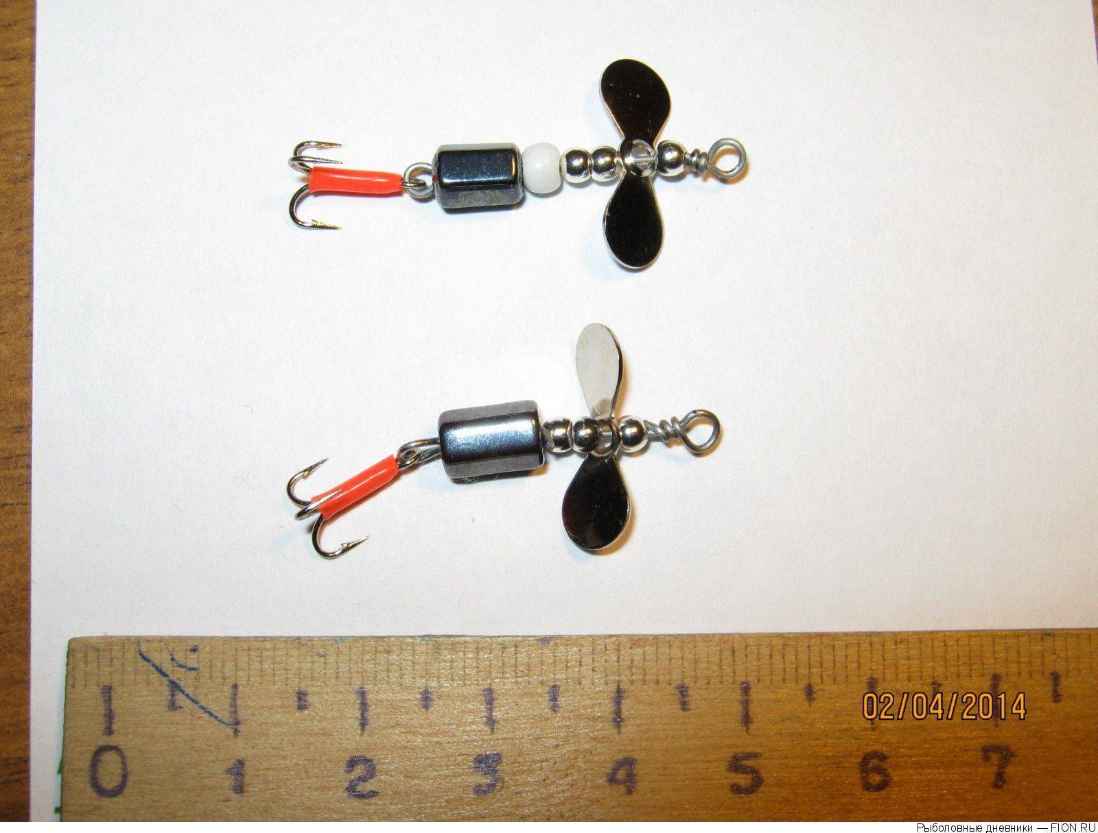 Относительно угла между лопастями могу дать некоторые объяснения. При закидывании приманки с бомбардой она будет лететь головой вперед, а прижатые лопасти лучше обтекаются воздухом, водой кстати тоже. В движении блесна напоминает вертушку и тем становится заметнее