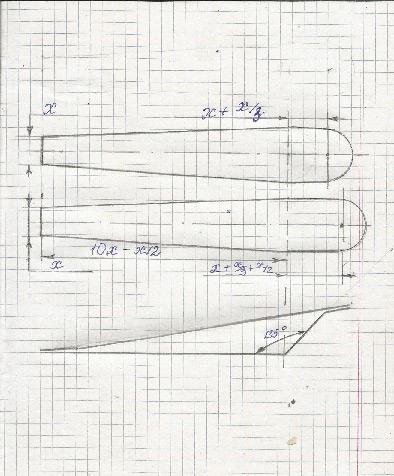 - На миллиметровке или на листе в клеточку изготавливается чертеж двух составных пластин блесны с пропорциями как на рисунке. (Изначально величина Х равнялась 6 мм).