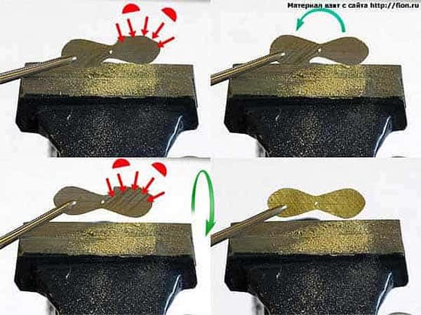 Кроме того, на аналогичной основе можно собрать другой тип вертушки, заменив лепесток на лопасти. Такая приманка называется турбинкой и является весьма уловистой, особенно при ловле окуня. Для её изготовления достаточно вырезать из медной пластины не лепесток, а пропеллер, после чего согнуть его лопасти под углом 60–80 градусов друг к другу, оставив между ними квадратную площадку с отверстием под основную проволоку.