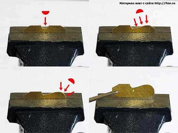 1. Заготовку нужно зажать горизонтально под отверстие в миниатюрных тисках и полукруглой стороной надфиля посередине, не доходя 2 мм от штриха, делается выемка. Дальше прямой стороной надфиля по направлению вправо снимается угол почти до вертикального штриха в 3 мм и обтачиваются два выступа, образовавшиеся после среза уголка.