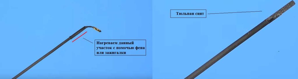 Также необходимо быть аккуратным и не допустить того чтоб, нагрелись остальные части удилища. Затем обвернув колечко тюльпана тряпкой или в перчатках (чтоб не обжечься), тянем его и снимаем с кончика удилища. Теперь очищаем поверхность от остатков клея, как на самом хлыстике, так и внутри снятого колечка тюльпана.