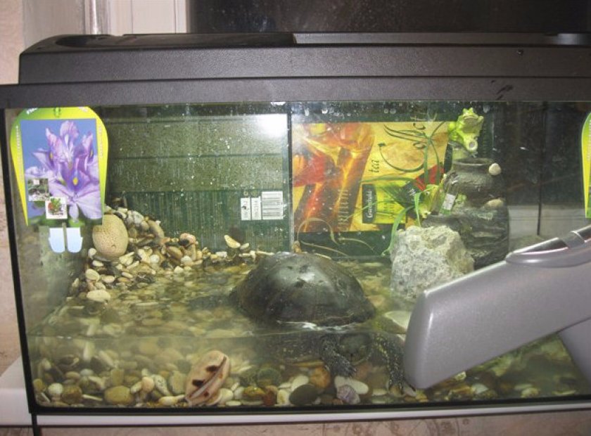 Воду подогревать надо электронагревателями, также необходимо установить помпу с фильтром. Дело в том, что ест и испражняется черепаха в воде, и если не чистить воду, то ее придется менять ежедневно.