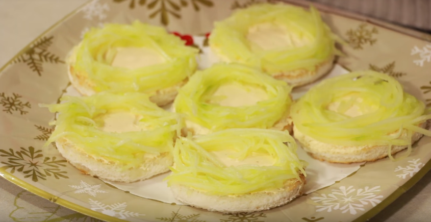 Приготовление: Сваренные вкрутую яйца и слегка размороженные крабовые палочки натри на самой мелкой терке, какую найдешь в доме. Смешай с остальными ингредиентами. Багет нарежь специальным ножом для хлеба тонкими ломтиками. Каждый покрой приготовленным салатом. Сложи горкой на блюде, укрась по желанию и подавай на стол.