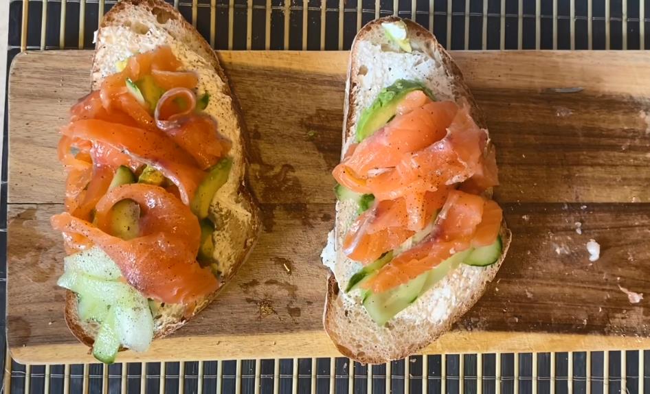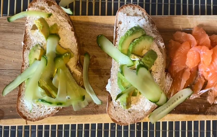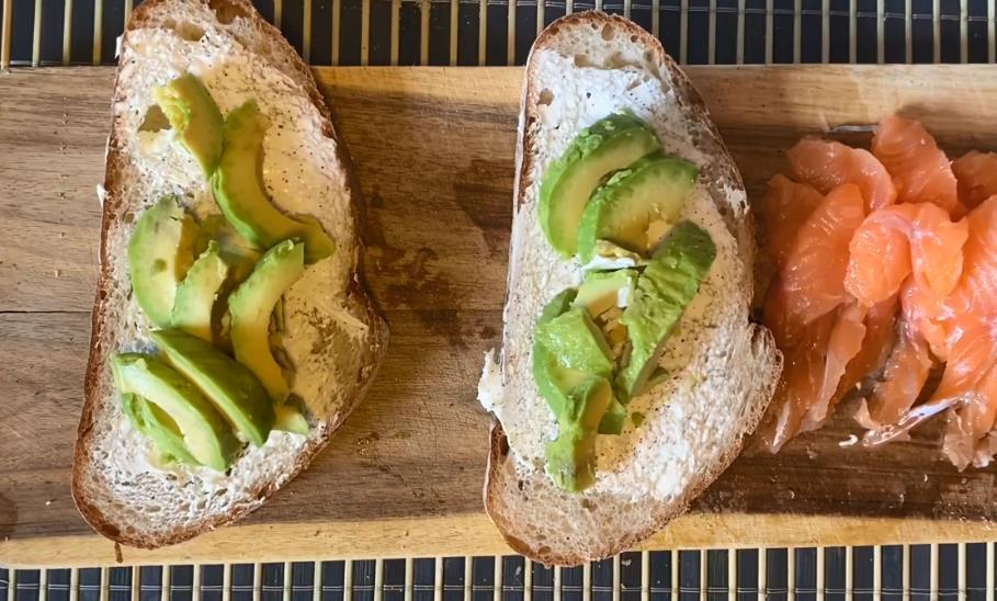 Собирают бутерброд: хлеб, рыба, дольки авокадо.
