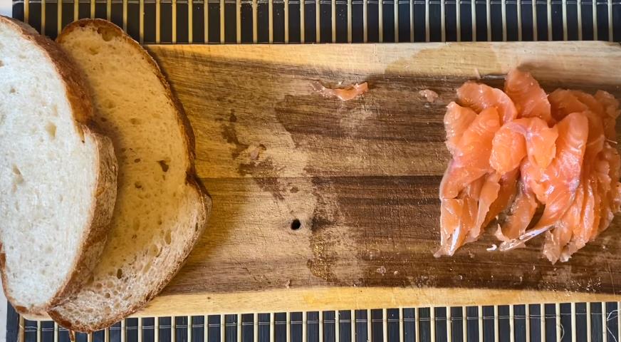 Нарезать буханку одинаковыми ломтиками. Срезать филе рыбы с кожуры, удалив лишний жир. Нашинковать мякоть тонкими лентами.