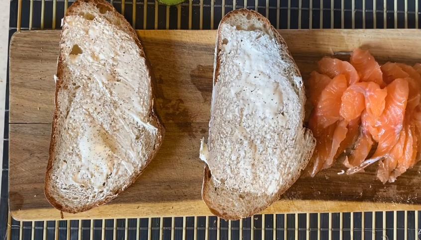 - Затем положите на каждый ломтик по одинаковому кусочку копченого лосося.