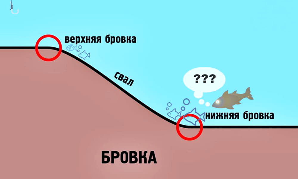 - Бровка — граница двух плоскостей, наклонной и горизонтальной. Именно сюда приплывает основная масса рыб в поисках пищи.