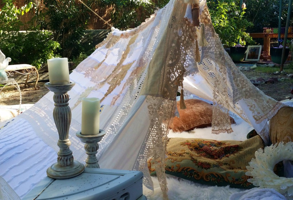 Продеваем каждую палку в чехол и собираем вигвам. Сверху фиксируем веревкой. При желании можно украсить его различными флажками.