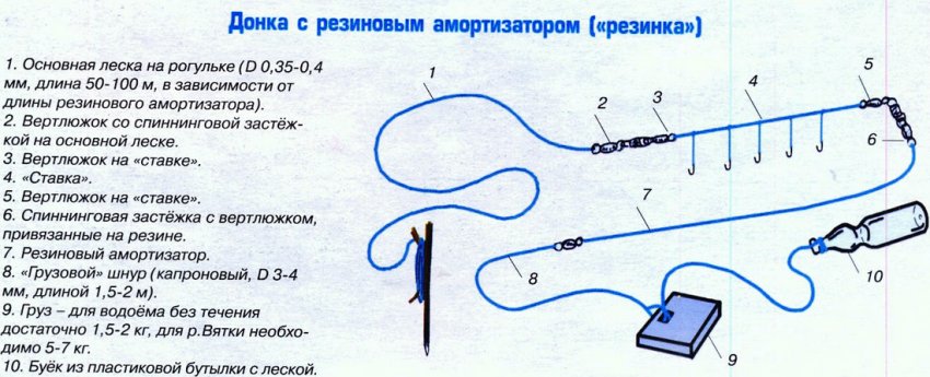 Особенностью изготовления донки с резинкой является монтаж в конце основной лески резинового амортизатора. Его крепят сразу за участком с поводками, а уже на конце самой резины располагают грузило. Грузы нужно выбирать, учитывая жёсткость амортизатора. Чем меньше и глаже грузило, тем слабее должен быть жгут, иначе массы утяжелителя не хватит, чтобы остаться неподвижным.