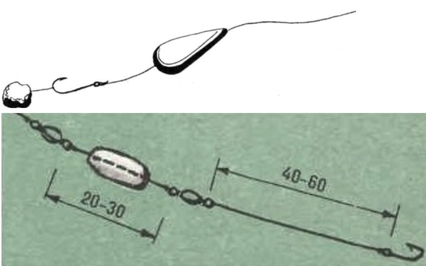 При рыбалке на течении или для увеличения чуткости снасти рыболовы иногда разносят между собой кусок жмыха и грузило, монтируя последнее скользящим.