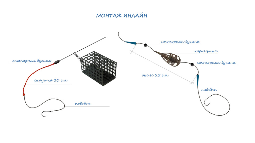 Свободное скольжение кормушки по основной леске («in line» переводится как «на линии») ограничивают бусин. Поводок с крючком может крепиться как через скрутку, так и через простое соединение.