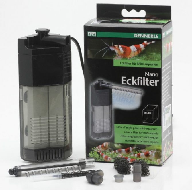Производительный угловой фильтр оборудован практичным компрессором, который работает ровно и тихо. Энергопотребление в 2 Вт позволяет сберегать природные ресурсы. Водный поток регулируется посредством поворотного сопла, оснащенного интегрированной заслонкой и щеточкой для очистки. Небольшие заборные отверстия и тонкопористый наполнитель предварительной фильтрации безопасны для разведения креветок. Фильтрующие элементы легко снимаются и очищаются. Во избежание гибели полезных бактерий советуем промывать материал в чистой емкости с аквариумной водой. Фото изделия можно посмотреть в интернете.