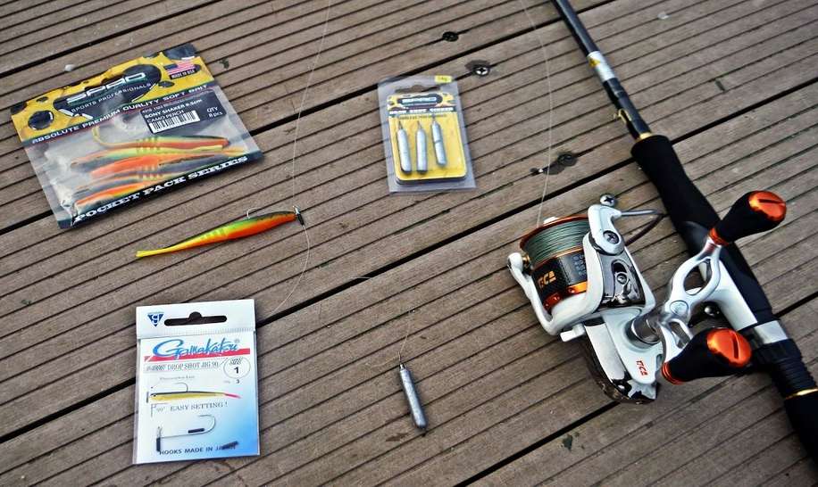 Чтобы эффективно рыбачить на drop shot с берега, нужна снасть для ловли окуня, оснащенная большим грузилом. Спиннинг выбирается от 2,4 до 3 м длиной, быстрого строя, чтобы можно было сделать заброс на глубокое русло. Используется безынерционная катушка размером от 2500 до 3000.