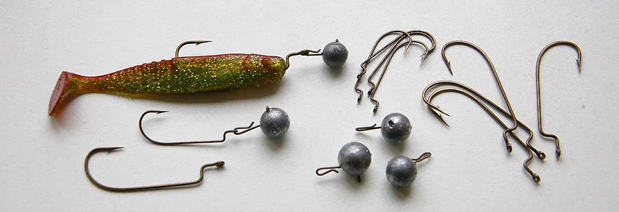 Используемые крючки должны иметь ушко для привязывания к леске. Крючки с лопаткой вместо ушка не подойдут. Рекомендуется использование крючков с длинным цевьем и отогнутым ушком, чтобы жало смотрело вверх. Широко применяются офсетные крючки. С их использованием снижается количество зацепов, силиконовые приманки лучше держаться на ступеньке возле ушка. Размерность крючков зависит от размера рыб и приманок.
