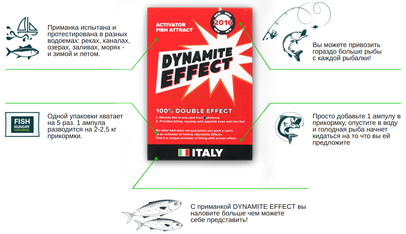 Он был создан итальянскими учеными в 2015 году. Благодаря своей эффективности и доступной цене Dynamite Effect уже успел стать популярным в десятках стран мира. Его полюбили и любители-новички, и профессиональные рыболовы.