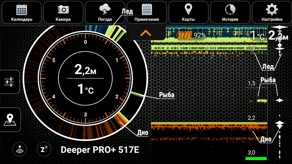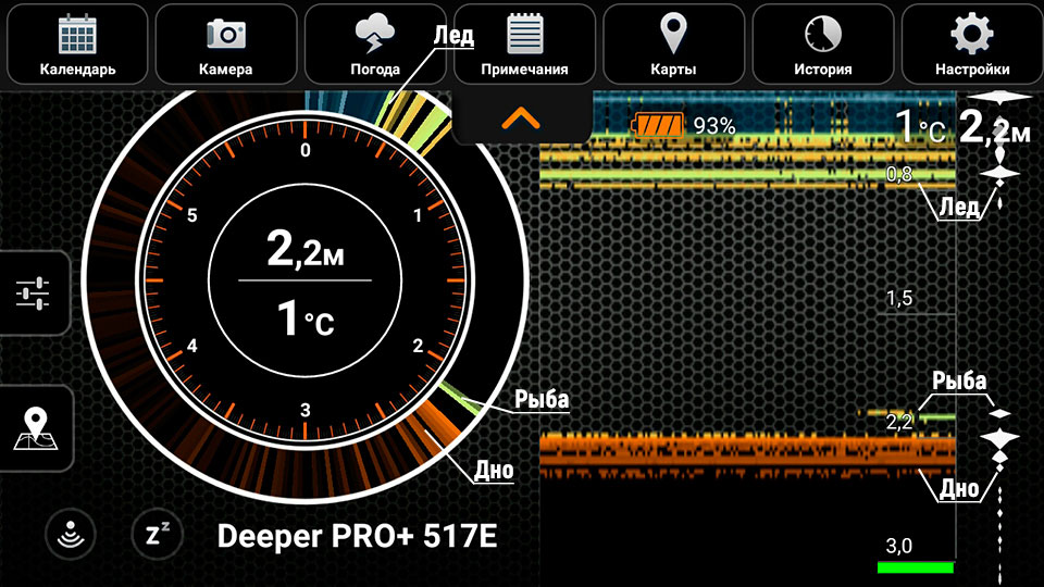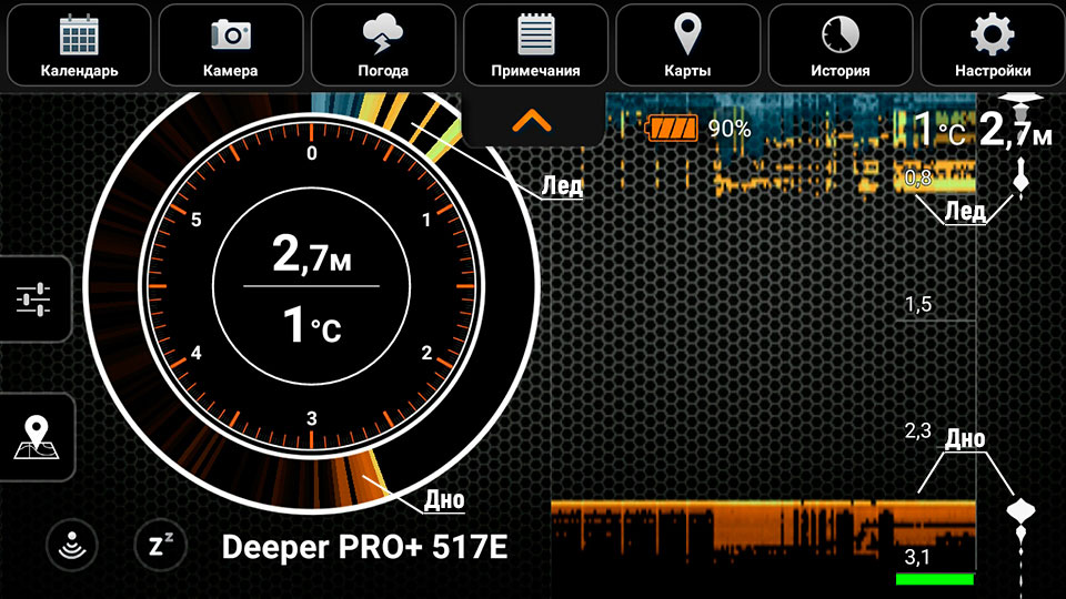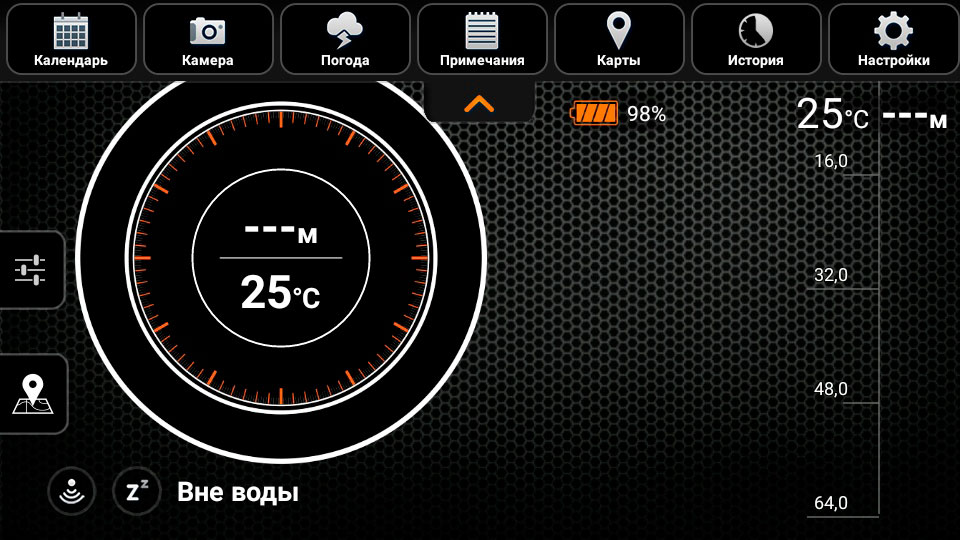 Справа на рабочем столе отображается глубиномер и указатель температуры воды, также эти данные дублируются в середине «круга-глубиномера». Слева для удобства есть вкладка быстрого доступа к некоторым настройкам. В этой вкладке можно выбрать чувствительность и включить «зум».