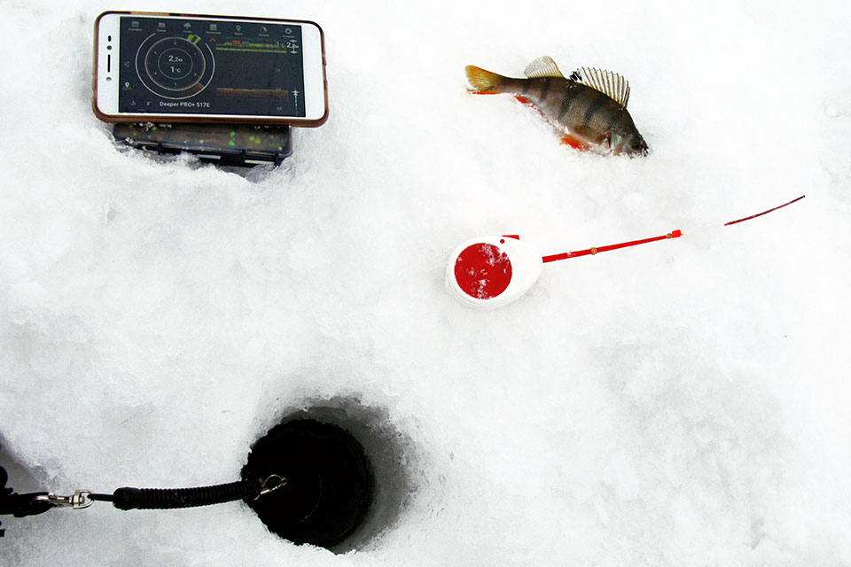 Эхолоты Deeper, в отличие от других устройств, не опускают под лед, они плавают на поверхности воды. Если лед слишком толстый, сигналы прибора будут от него отражаться и искажать информацию. Для улучшения ситуации необходимо сделать лунку шире и расположить шар в ее центре.
