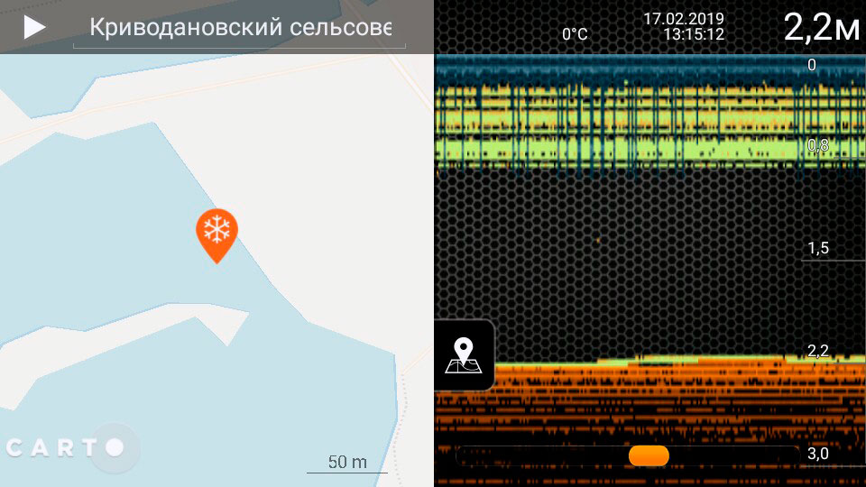 Также эхолот может работать и через лед. Для этого кладем эхолот на ледовую поверхность, прибор включается, и мы узнаем, что творится в водоеме, не буря лунки! Единственное условие для этого, лед должен быть достаточно увлажнен, а также должна присутствовать небольшая лужица на поверхности. По последнему, мокрому льду эхолот уверенно работает в таком режиме. А GPS-модуль передает информацию о вашей локации на карту в этом же приложении.