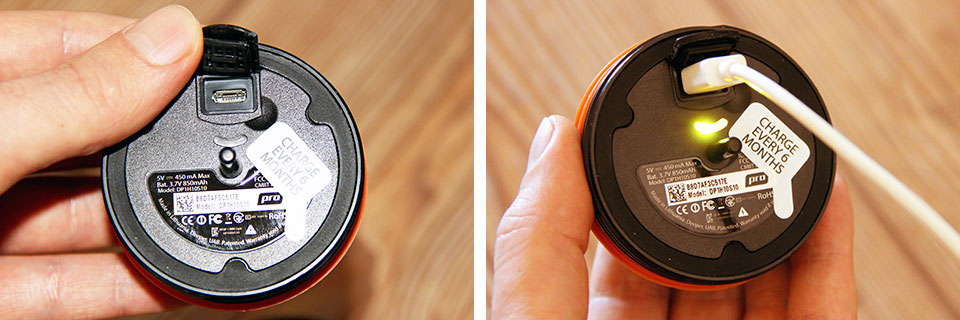 Судя по стикеру на внутренней части «полусферы» эхолота, применять зарядное устройство необходимо с напряжением 5V и током 450 mA, т.е. вполне можно заряжать эхолот от компьютера или другого устройства с USB выходом. Зарядное «гнездо» располагается с внутренней стороны полусферы эхолота под резиновой заглушкой. Шнур для зарядки был в комплекте, но у меня, к сожалению, он потерялся, поэтому заряжаю подходящим шнуром от смартфона. При подключении зарядного устройства на эхолоте начинает мигать светодиод. Как только аккумулятор зарядится, светодиод перестает мигать и светится непрерывно.