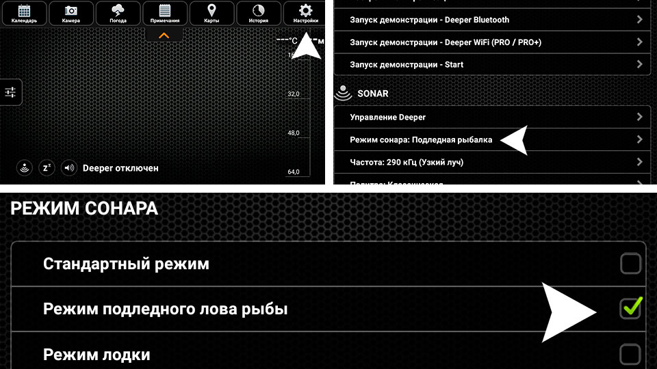 Для зимней рыбалки нужно включить режим флешера. Для этого переходим во вкладку «настройки» и выбираем в подпункте меню «режим сонара», затем выбираем режим «подледного лова». Собственно и всё. На экране отобразится круглая шкала флешера.