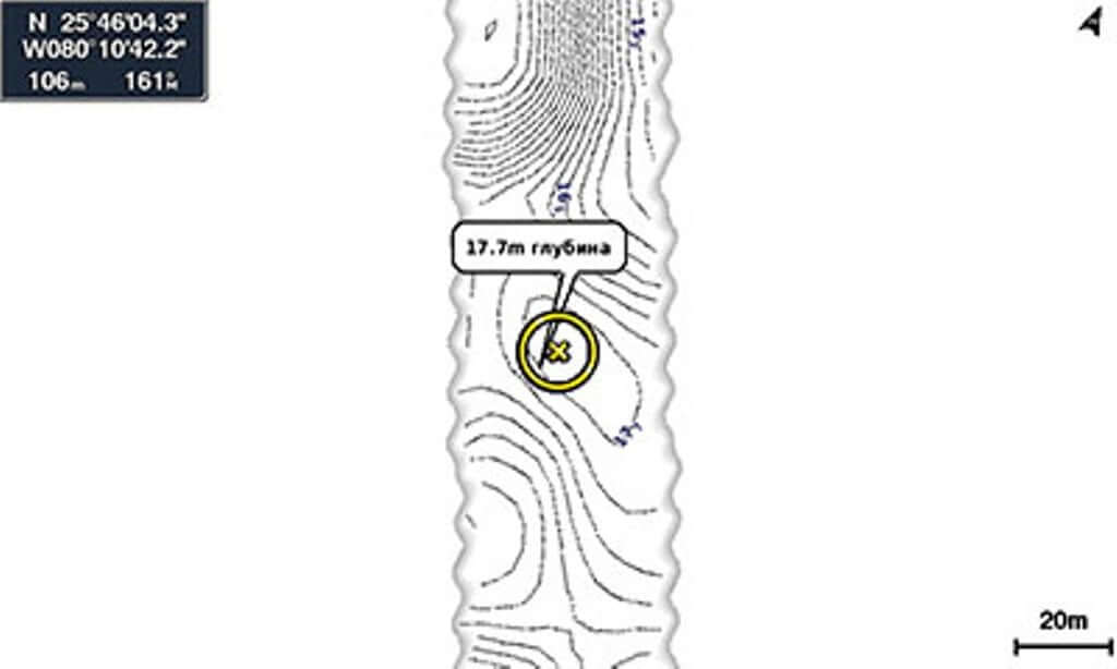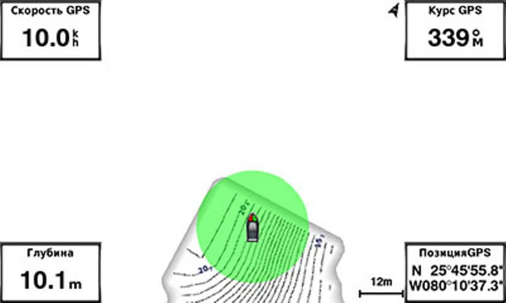 Карты создаются самостоятельно, то есть можно наблюдать исключительно свои маршруты с изобатами шагов 30 см. Они могут фиксировать и хранится в памяти прибора. Такой подход очень удобен, поскольку большинство стандартных карт не отражают реальный подводный рельеф. Высокая детализация изображения позволяет видеть даже самые мельчайшие очертания дна, включая потонувшие коряги или камни, с отображением глубины залегания.
