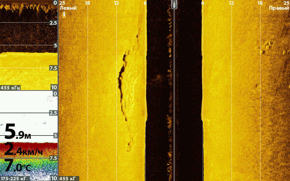 линия посередине, режущая экран пополам – ход нашего плавсредства. Темная дорога – это толща воды. Теперь представьте, что дно, которое имеет желтый цвет, лежит в другой плоскости. Так, словно бы лист формата а4 согнули пополам, создав угол 90 градусов, где одна плоскость показывет нам толщу воды, а другая дно. На дно, при этом, мы смотрим сверху вниз. Луч датчика боковго сканирования выставлен на 25 метров, о чем свидетельствует разделительная шкала сверху экрана – 6, 12, 18 и 25 метров. Датчик бокового сканирования выставлен на частоту 455 кГ, которую мы считаем оптимальной. Частота сканирования отображена в нижнем левом углу экрана, каждого из трех режимов сканирования. В левом нижнем углу общего экрана отображается глубина ( 5,9 м ), скорость движения ( 2,4 км/ч ) и температура воды ( 7,0 С ).