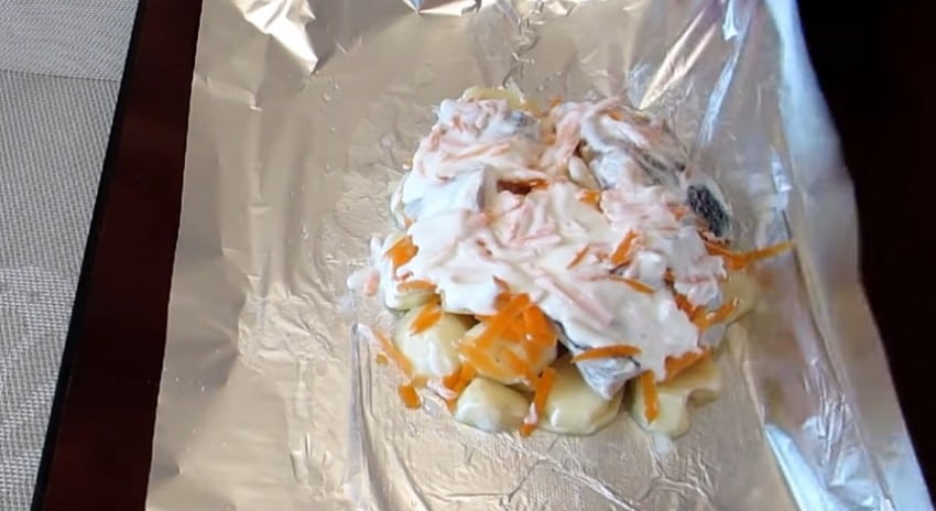 5. Для первой порции: поместите на противень фольгу и смажьте её маслом. Сначала выложите картофель, потом рыбу, сверху – натёртую морковь. Оставшуюся сметану подсолите, и смажьте верх запеканки. Края фольги заверните встык, концы закрутите, как у конфеты. Останется небольшой зазор по центру. Так же сформируйте 3 оставшиеся порции.
