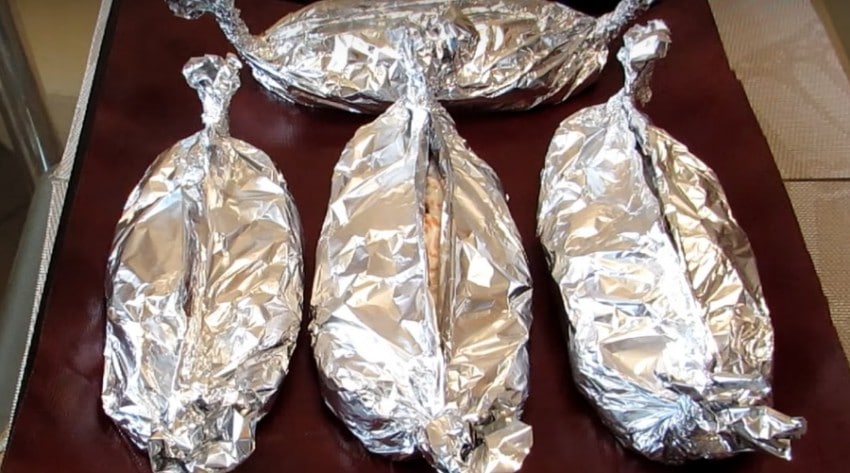 Расстилаем фольгу и смазываем оставшимся растительным маслом. Укладываем судака и заворачиваем. Делаем это очень аккуратно, чтобы не порвать фольгу.