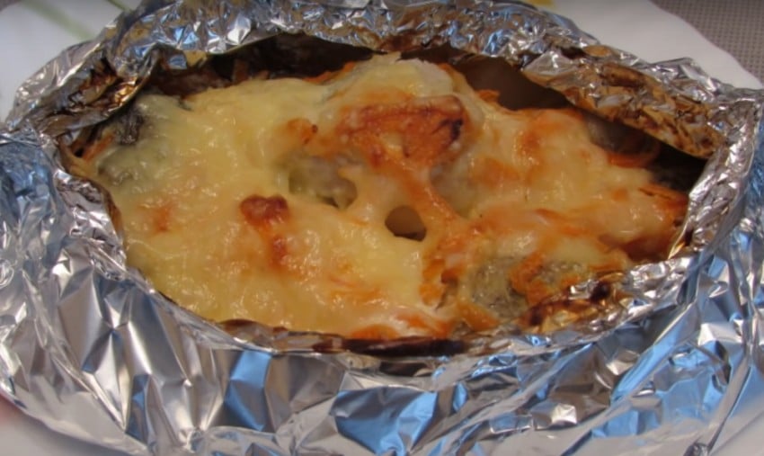 7. Затем достаньте противень, раздвиньте края фольги и посыпьте каждую порцию натёртым на крупной тёрке сыром. Уберите в духовку ещё на 7-10 минут, чтобы сыр расплавился и подрумянился.