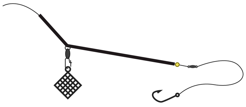Эта фидерная оснастка интересна тем, что является весьма и весьма чувствительной к рыбьей поклёвке. Хорошо работает в условиях ловли при активном клёве.