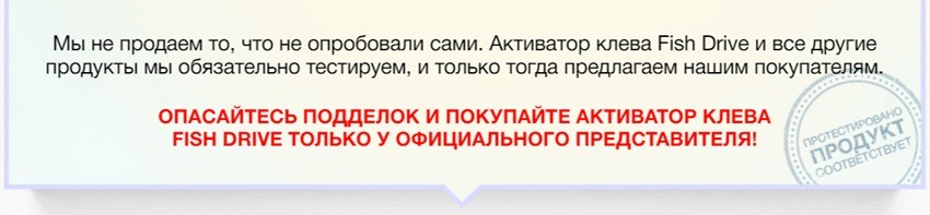 Изготовитель говорит о Фиш Драйве как о продукте, не имеющем аналогов. Производитель называет следующие преимущества активатора клева по сравнению с другими приспособлениями для ловли рыбы: