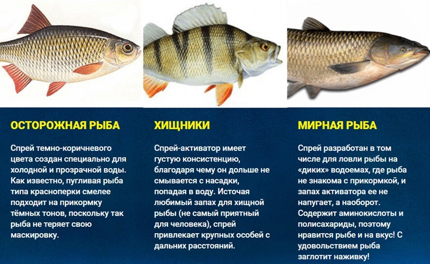 Также в продажу поступают аэрозоли, которыми можно опрыскивать приманку. В зависимости от состава активатора будет меняться дальность его действия. Чаще всего питательная субстанция распространяет аромат на расстоянии 80-100 метров.