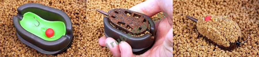 В большинстве формочек mould в теле есть специальная ямка, в нее мы ложем насадку, а повадок выводим через отверстие, далее с горкой насыпаем в формочку прикормку и сверху вставляем кормушку, затем с ощутимым усилием вминаем кормушку в mould. Для того чтоб вытянуть кормушку из формочки, мы тянем за специальный хвостик кормушки. Для того чтоб прикормка не липла к стенкам формочки, их можно периодически смазывать подсолнечным маслом, достаточно пары капель на палец и пройтись им по стенкам пасочки.