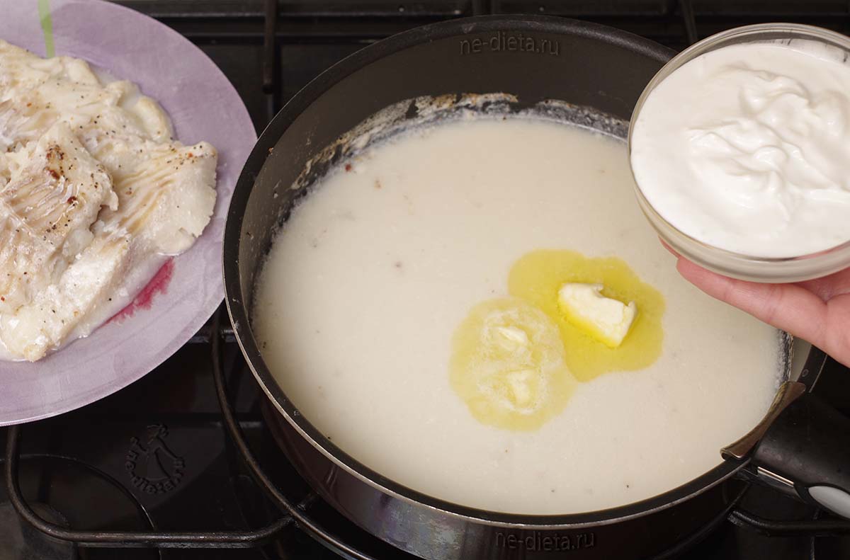 Для начала приготовим чесночный соус, благодаря которому рыбка приобретет неповторимый вкус. В сотейнике растопите 40-50 грамм сливочного масла, когда оно полностью растворится, всыпьте измельченный чеснок. Когда появится стойкий чесночный аромат, всыпьте столовую ложку муки, тщательно перемешайте, подержите на медленном огне 3-4 мин.