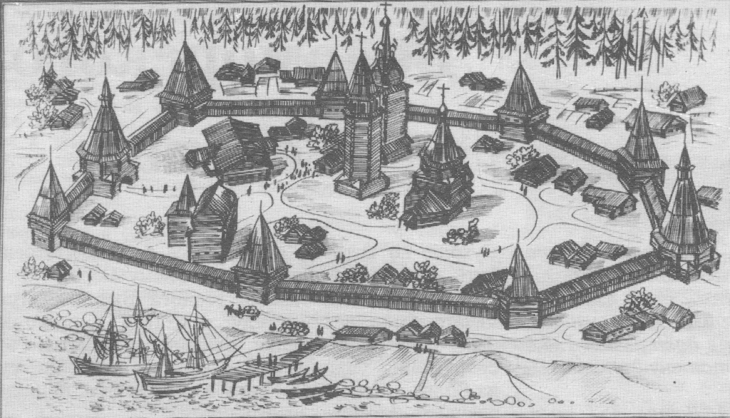 В 1584 году по указу Ивана Грозного началось строительство крепости и большой пристани на другом, более удобном месте. Правда, это место… опять оказалось под боком у монастыря, точно так же давным-давно основанного тут новгородцами, — Михайло-Архангельской обители.