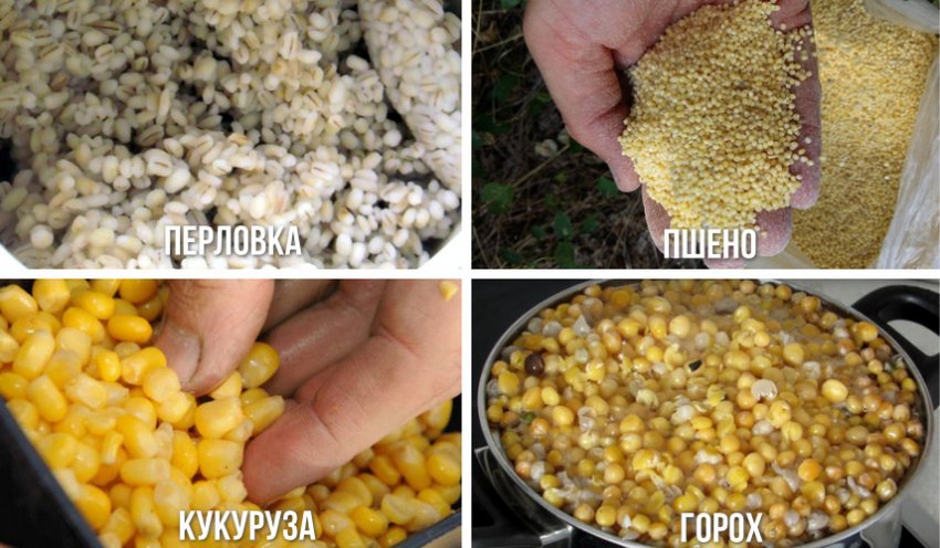 - зерна злаковых и бобовых, кукуруза, молодые побеги (в теплой воде);