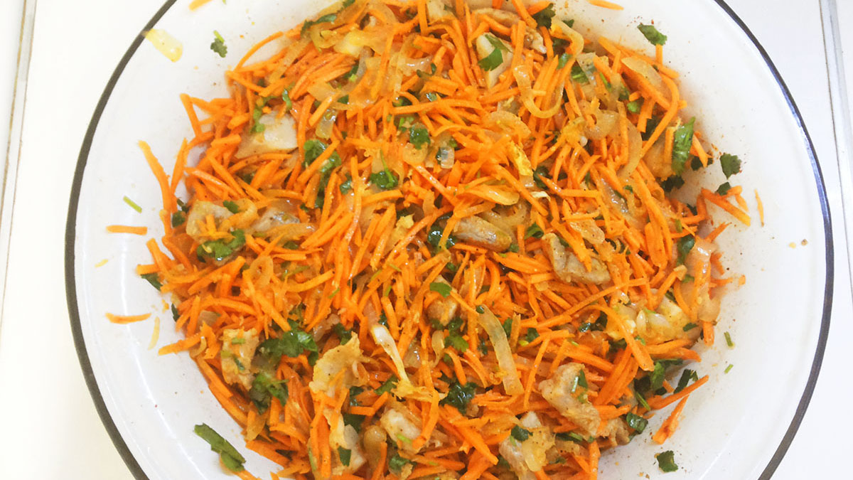 Когда рыба замариновалась, начинаем все соединять. Первым делом отжимаем морковь от сока. Рыбу тоже отжимаем и кладем на морковь. Оставшийся сок не выливаем, им мы будем регулировать кислотность салата.