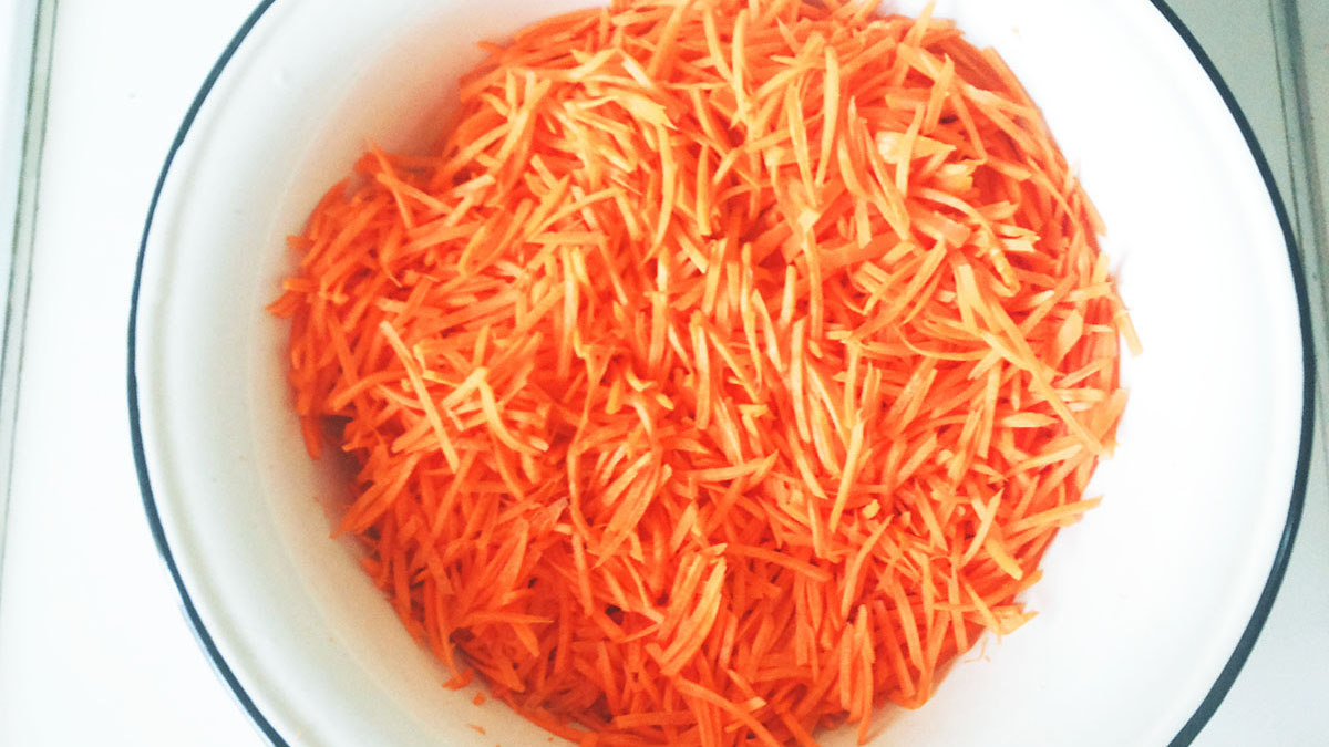 Морковь очистите, и потрите на терку для моркови по-корейски или же на обычную крупную терку. Сдобрите ее пряностями и специями, указанными в рецепте, однако, с расчетом на то, что они еще понадобятся для приготовления заправки.