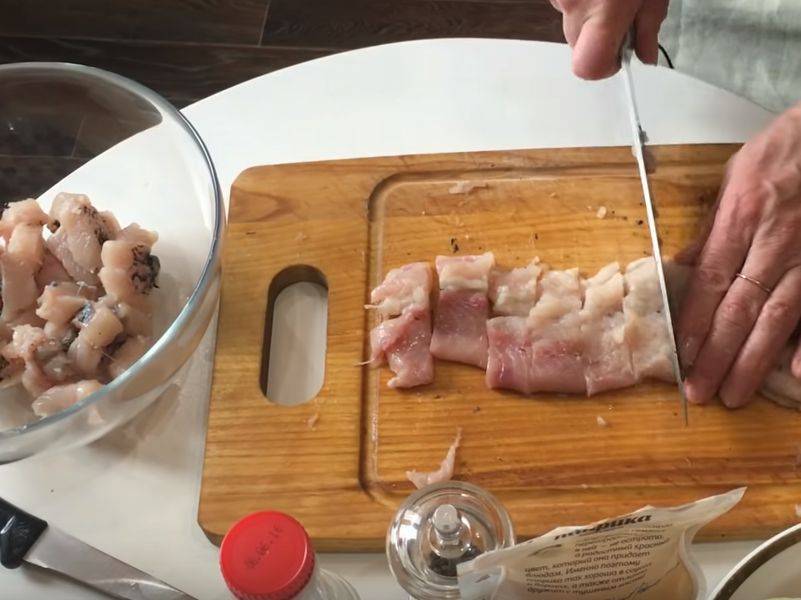 - Очищаем филе от кожуры и хребта при помощи ножа. Извлекаем косточки из рыбного филе, затем нарезаем его на довольно крупные кусочки.