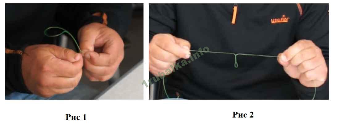 Теперь вяжем скрутку, для этого берем леску толщиною 0,25-0,3 мм,  складываем ее, зажимаем большим и указательным пальцами и начинаем крутить в одном направлении (смотри рис 1), для того чтоб на выходе у нас образовалось небольшое кольцо, куда мы будем крепить повадок, скрутку подтягиваем (смотри рис 2). Скрутка делается длинною 15-20 см, на конце нашей скрутки, мы вяжем петлю восьмерку, дабы уберечь ее от самопроизвольного развязывания. Усы, что останутся после вязки скрутки, обрезаем под ноль.
